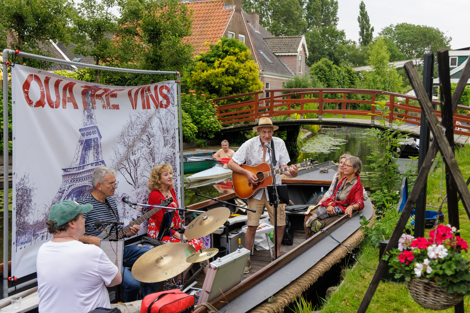 Quatre Vins bestaat in de huidige samenstelling alweer 9 jaar en er zijn in die jaren optredens geweest op hele mooie en hele bijzondere plekken zoals een huiskamer, een boot in een sluis, een festival of een groot feest zoals Muziek aan de Middenweg of Reuring